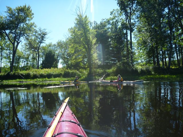 On the recent holiday weekend some friends and I went to Sandbanks Provincial Park for a little paddle. Hoping for some serious surf action, I took along my paddling helmet. Well, it was dead calm, but at least warm and sunny. We paddled along the park beach, but the more interesting paddle turned out to the the little stream which connects East Lake to Lake Ontario.