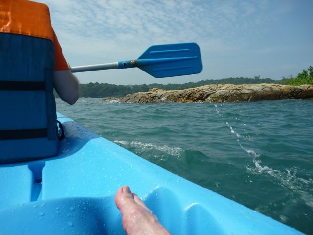 Well, here we are. A kayak of sorts. A bit on the heavy side, but definitely a kayak. Now to see if it's for rent and at what price. Being with my son, we decided to opt for a double and had it towed across the beach to the water. It was much too heavy to carry easily! Checking out the hatch - partly full of nasty black bilge-water - I decided to leave my shoes and towel ashore. The life jackets were not that form-fitting and the paddles probably doubled as agricultural tools at some point during the year, but we were going kayaking nonetheless!